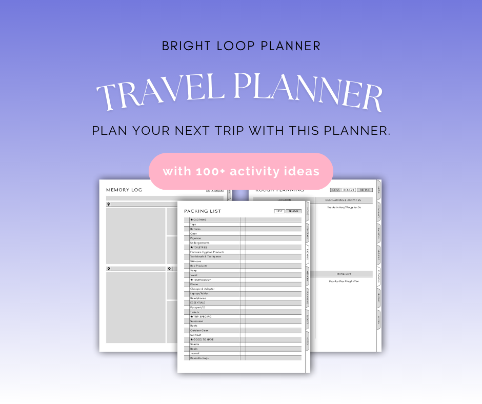 With thoughtfully designed pages—including a Trip Log, Budget Tracker, Planner Hub, Places to Visit, and an Idea Hub—you can seamlessly organize every detail while also journaling your experiences with photos and notes. From mapping out your itinerary to reflecting on unforgettable moments, this planner ensures no memory is left behind.